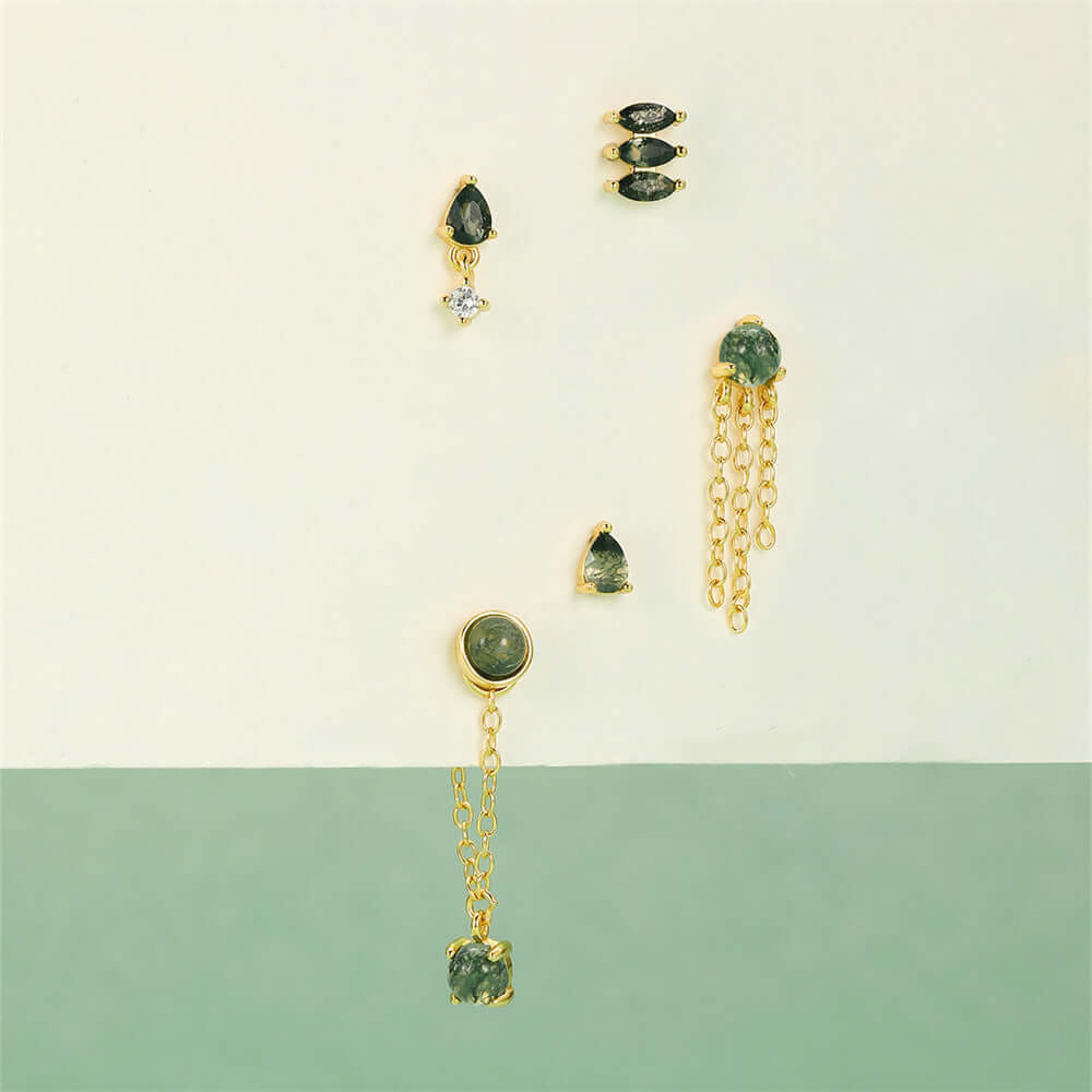925 Silver Natural Three Tassel Moss Agate Flat Back Earrings